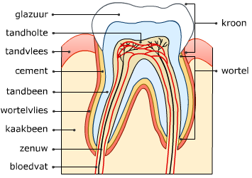 Het gebit bestaat uit tanden en kiezen. Het deel van de tand of kies dat boven het tandvlees uitsteekt wordt de kroon genoemd. Tanden hebben één wortel, kiezen hebben één of meer wortels. Tanden en kiezen zijn bedekt met een laagje glazuur. Glazuur is harder dan tandbeen. Met het wortelvlies zitten tanden en kiezen vast aan de kaak.